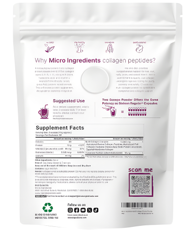 Micro Ingredients 8 en 1 es un polvo de péptidos de colágeno hidrolizados de espectro completo pensado para integrarse fácilmente en tu rutina. En cada porción, aporta hasta 0.39 oz de péptidos de colágeno de animales criados en pastos, elaborado con colágeno hidrolizado premium para una mezcla rápida y eficiente.